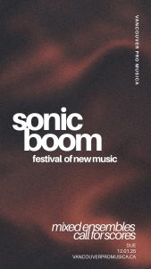 Vancouver Pro Musica is pleased to invite all BC composers to submit new works for our 2026 Sonic Boom Festival of New Music: Mixed Ensembles & Fixed Media Concerts. Selected works will be presented as part of the 2026 Sonic Boom Festival of New Music running March 20 and 21, 2026. Please click HERE to be directed to the full details of the call.