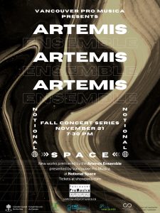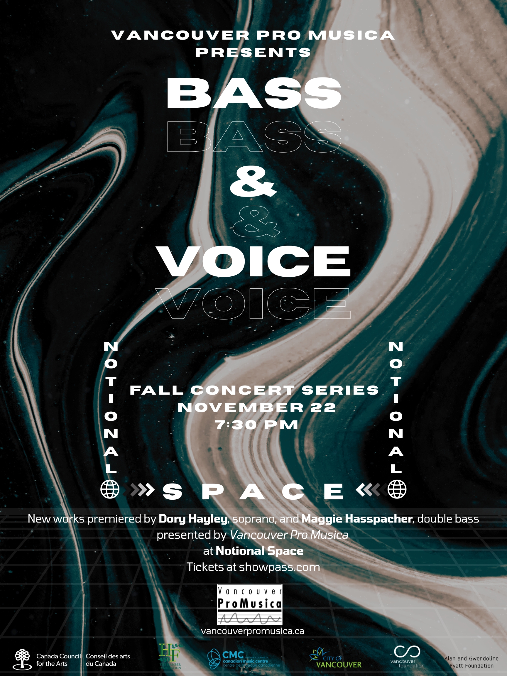 Vancouver Pro Musica is excited to present two exciting concerts of new music composed by BC composers this November! Please join us at Notional Space on Friday, November 21 for the Artemis Ensemble performing 6 new works and Saturday, November 22 for Dory Hayley, soprano and Maggie Hasspacher, double bass, performing 10 new works! Both concerts will start at 7:30pm.